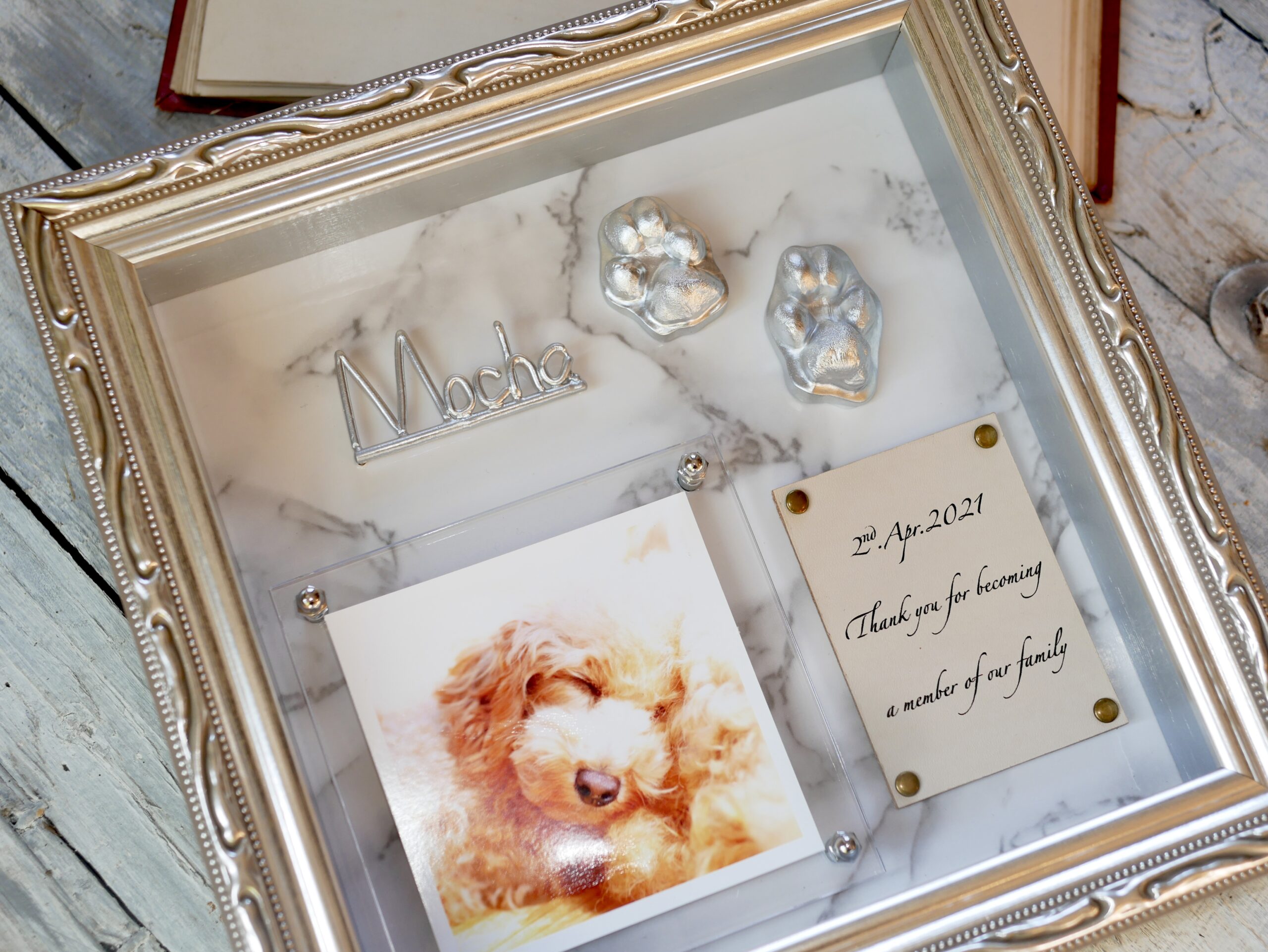 ペットの足形アートでは、まだ額縁タイプは作品として載せられておりませんが、お子様同様お作りできるますので、お気軽にご連絡下さい。