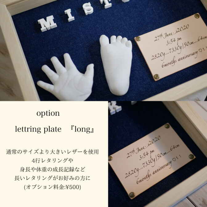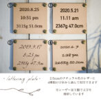 背景にはデニム生地、選べる2種類の立体石膏文字、残したい記録をレザープレートにお客様のご希望に合わせてアレンジ出来ます