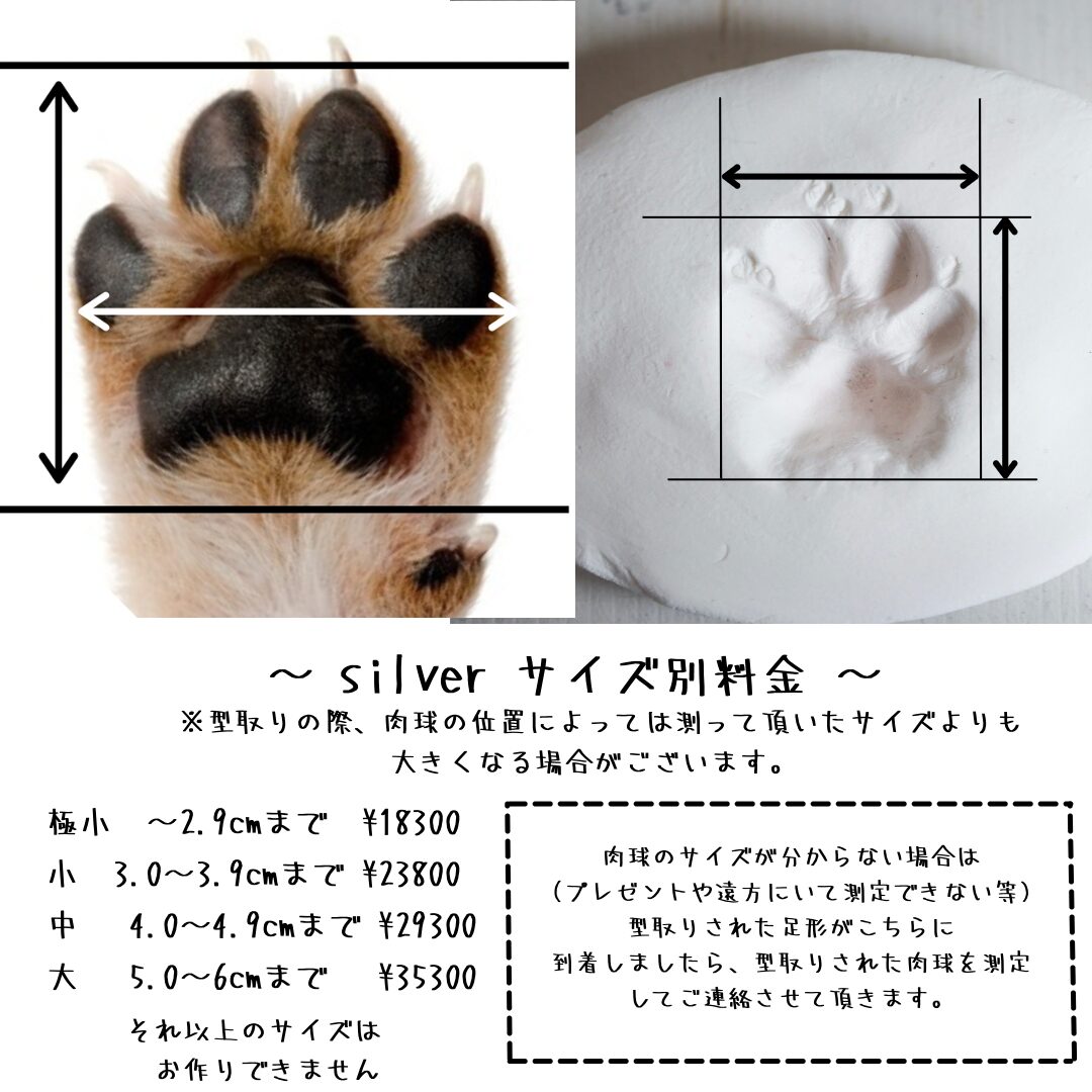 肉球の位置によっては測定されたサイズを超える場合がございます。返送後、当店でもサイズ測定させて頂き、予定より超えている場合はご連絡させていただきます。